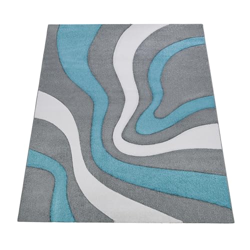 Tappeto Di Design Motivo Ondulato Orlo Lavorato A Mano Colori Grigio Turchese Bianco, Dimensione:60x110 cm