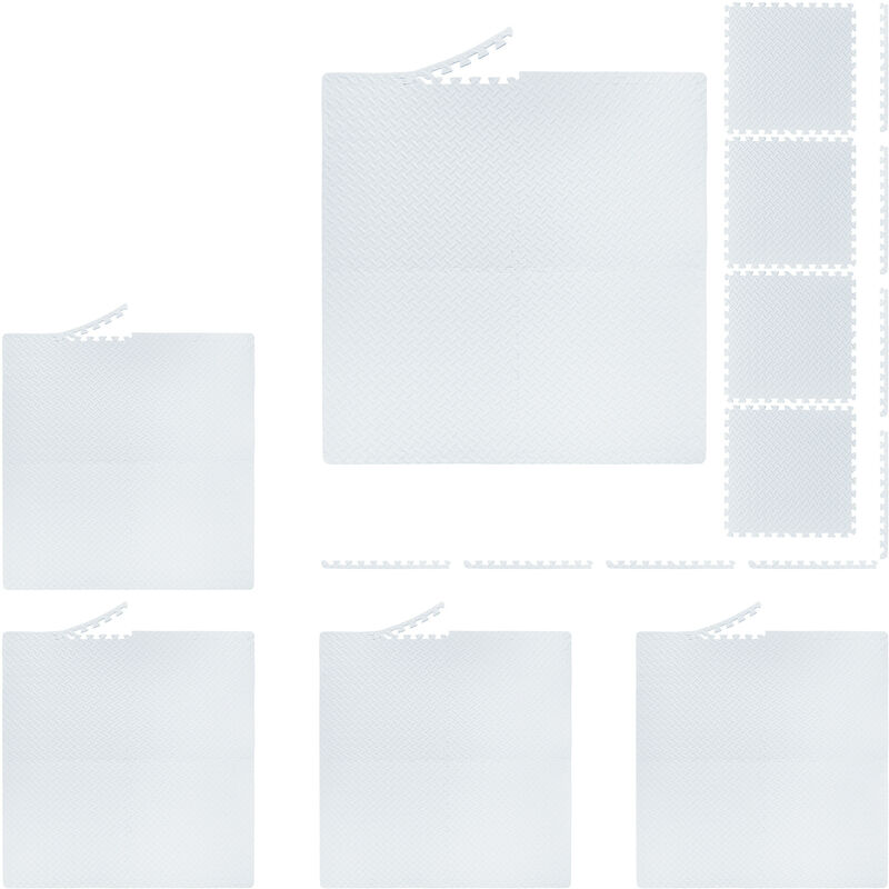 Riduci al minimo i danni al pavimento e il rumore durante gli allenamenti in casa con gli attrezzi da fitness grazie a questo tappetino da palestra. I 24 tasselli a puzzle con 48 strisce per il bordo possono essere incastrati come vuoi tu, per creare la base perfetta per attrezzature sportive, come panche o tapis roulant, o pesi. Usa il tappeto da fitness per esercizi addominali o yoga. Non solo risparmi danni al tuo parquet o piastrelle, ma risparmi anche fastidi ai vicini di casa. Tappeto da fitness a puzzle in dettaglio - Misure per piastrella L x P: 60 x 60 cm ca. - Misure del bordo L x P: 4 x 62 cm ca. - Spessore di ogni tassello: 1 cm ca. - Superficie totale del tappeto: 9 m² ca. - Peso di ogni elemento: 270 g ca. - Materiale: EVA, senza BPA - Colore: bianco Tappeto per allenarsi a casa - Set da 24x tasselli in gommapiuma senza BPA - Tappeto da fitness a puzzle per gli home workout - Da combinare a piacimento - Con parti dritte da attaccare ai bordi - Effetto antiurto
