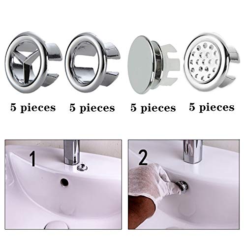 Adatto a fori troppopieno standard da 22 a 24 mm. La confezione include 20 coperture per tappi di scarico, ognuno dei quali è 5, che è sufficiente per l'uso quotidiano. È possibile scegliere diversi stili di anello di troppopieno in base alle proprie esigenze.
