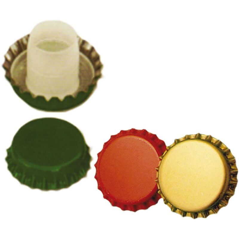 Tappo corona gigante Ø 29 mm. completo di sottotappo con bidule incorporato, colori assortiti oro, rosso, verde. Confezione 200 pezzi