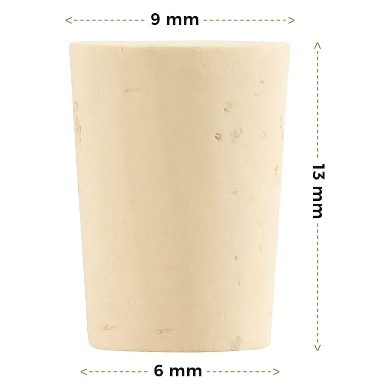 100 tappi a punta con un diametro compreso tra 6 e 9 mm e una lunghezza di 13 mm. I tappi sono realizzati in puro sughero naturale senza additivi o adesivi, punzonati dalla corteccia della quercia da sughero. I tappi a punta in sughero sono adatti per la chiusura di vasi con un diametro di apertura di 5-8 mm. Ideale come tappo per medicinali o per uso in laboratorio. I tappi conici in sintesi: Diametro 6-9 mm appuntito. Lunghezza: 13 mm. In puro sughero naturale proveniente dal Portogallo. Senza additivi o adesivi.