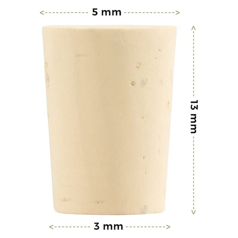 100 tappi a punta con un diametro compreso tra 3 e 5 mm e una lunghezza di 13 mm. I tappi sono realizzati in puro sughero naturale senza additivi o adesivi, punzonati dalla corteccia della quercia da sughero. I tappi a punta in sughero sono adatti per la chiusura di vasi con un diametro di apertura di 2-4 mm. Ideale come tappo per medicinali o per uso in laboratorio. I tappi conici in sintesi: Diametro 3 - 5 mm. Lunghezza: 13 mm. In puro sughero naturale proveniente dal Portogallo. Senza additivi o adesivi.