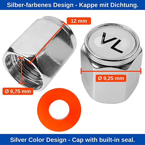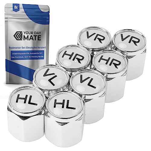 ✅ [LA CONSEGNA INCLUDE] 8 tappi per valvole pneumatici auto, in Argento, in Alluminio, Versione per la Germania (DE), 2 iscrizioni ciascuna: HL, HR, VR, VL