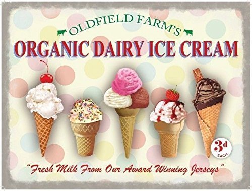 Targa con coni gelato, con scritta "organic dairy ice cream" (lingua italiana non garantita), gelati alla fragola, vaniglia, cioccolato, flake, sundae, targa pubblicitaria stile antico, retro, vintage per cucina, casa, bar, caffetteria, ristorante, salotto o pub, targa da parete in acciaio, Acciaio, 9 x 6.5 cm (Magnet)