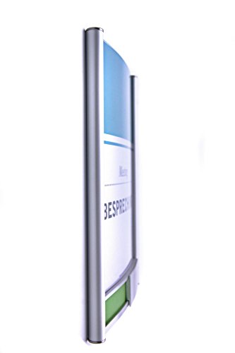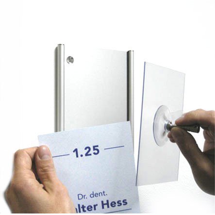 Targhetta per porta composta da: 1 corpo di base in alluminio leggermente bombato con listelli tondi laterali, Ø 9 mm, colore argento naturale anodizzato, tappi di chiusura in acciaio inox, 1 disco acrilico antiriflesso