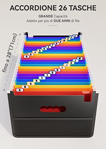 【ALTA QUALITÀ E ALTA CAPACITÀ】 Le 4 fibbie rinforzate in metallo agli angoli superiori e il design del bordo overlock sul bordo laterale, sono durevoli, resistenti all'acqua e non facili da rompere e deformare. 26 tasche perfette per archiviare i tuoi file in formato A4 e Letter, sono ferme, in grado di contenere oltre 3500 fogli.