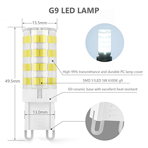 【Alta qualità】 Lampadina led g9 5W, 500 lm, 51 LEDs bianco freddo 6500 K, è la scelta ideale per sostituire le lampade alogene da 50 W che si riscaldavano enormemente.