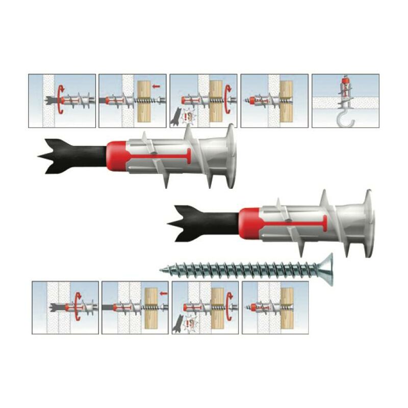 Tassello autoforante per installazioni su pannelli e lastre di cartongesso, pronto all'uso con punta metallica preinstallata, all'inserimento della vite la punta viene espulsa cadendo nel vuoto retrostante, le lamelle anti-rotazione garantiscono il bloccaggio del tassello in fase di installazione della vite. Adatto per installazioni non passanti. In bi-materiale (nylon e fibra di vetro) Puo' essere abbinato a viti legno, autofilettanti o truciolari 4,0/5,0 mm.