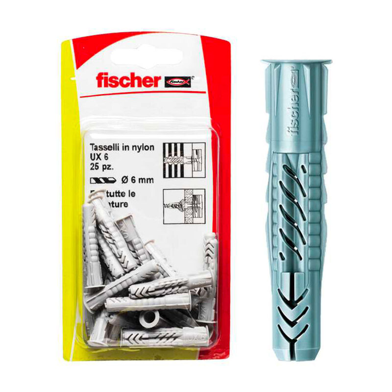 Applicazione: Calcestruzzo Mattone pieno in laterizio Mattone pieno in silicato di calcio Blocco pieno in calcestruzzo alleggerito Mattone semipieno (perforato verticalmente) in laterizio Mattone semipieno (perforato verticalmente) in silicato di calcio Blocco cavo in calcestruzzo alleggerito Calcestruzzo cellulare Solaio cavo in calcestruzzo e mattoni Lastra in cartongesso e pannello in fibra di gesso Pietra naturale Pannello truciolare Pannello pieno in gesso Tasselli Fischer in Nylon U x 10K 10Pz Il principio di funzionamento universale (ad annodamento o espansione) permette il suo utilizzo in tutti i materiali di supporto pieni, forati e in lastre. Il fissaggio UX è la scelta giusta se non si conosce il materiale di base. Le alette laterali dell'UX assicurano una guida ottimale della vite. Le alette seghettate anti-rotazione impediscono la rotazione nel foro. Questo garantisce la massima sicurezza durante l'installazione. I kit di fissaggio con viti, gancio e gancio tondo
