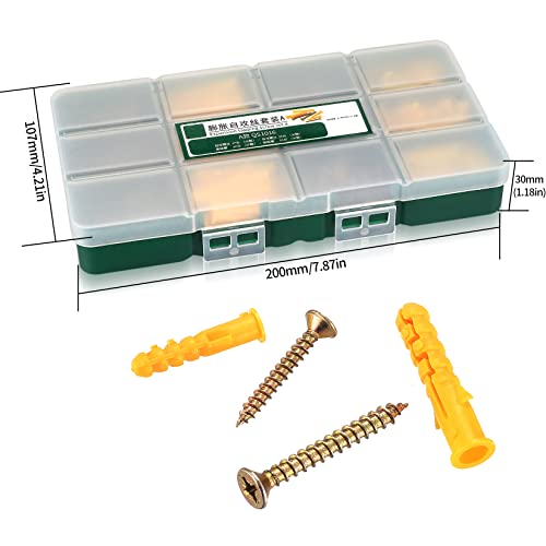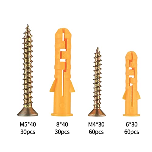 La confezione include: Riceverai 90 pezzi viti per legno autofilettanti: 60 pezzi m4x30mm, 30 pezzi m5x40mm e 90 pezzi tasselli da parete in plastica: 60 pezzi m6x30mm, 30 pezzi m8x40mm, per un totale di 180 pezzi. Tutti sono collocati in una scatola di immagazzinaggio, comoda per il trasporto e lo stoccaggio, e le dimensioni e la quantità sono sufficienti per soddi