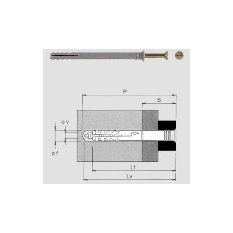 Fischer Tassello in Nylon prolungato con Vite modello N 6 - 80. Ideale per fissaggi leggeri di profili e serramenti metallici o in legno. Utilizzabile su calcestruzzo e calcestruzzo poroso, pietra naturale e mattone pieno. Confezione da 37 pezzi. Tassello in nylon dotato di una vite a chiodo in acciaio zincato giallo premontata per l'installazione a percussione. La particolare forma interna del tassello impedisce allo stesso di espandersi anticipatamente nella fase di percussione durante l'installazione. Dimensioni: Lunghezza tassello: 80 mm Profondità minima foro: 95 mm Diametro punta: 6 mm