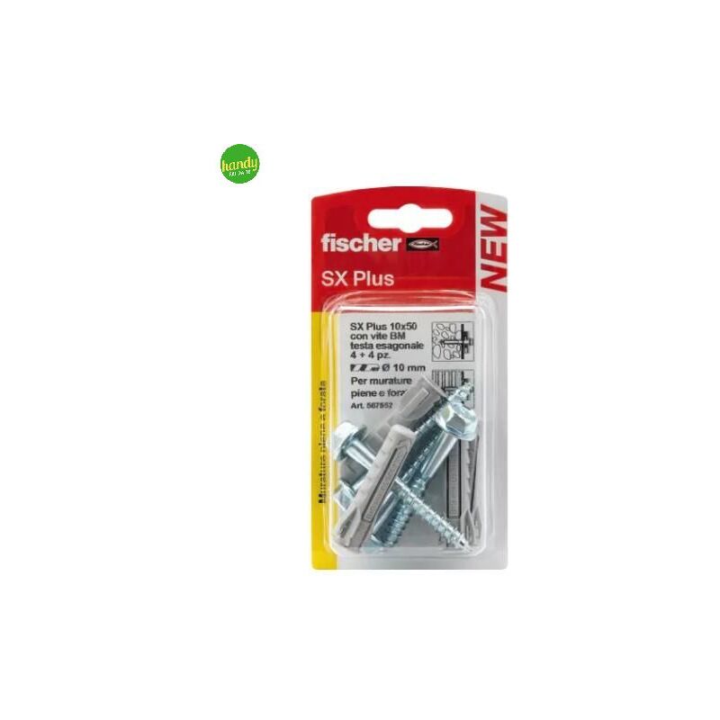 Tasselli + Vite + Punta SX Plus prodotti dal brand Fischer. Il tassello in nylon fischer SX Plus, grazie all'espansione a 4 settori, trasferisce le forze in modo ottimale nel supporto, assicurando una tenuta perfetta nei materiali da costruzione pieni e carichi elevati su tutte le murature. L'innovativo design del tassello garantisce un feeling di installazione perfetto, con una coppia di serraggio sempre sotto controllo. SX Plus è il fissaggio leggero ideale per artigiani e professionisti, ma facile e rapido da utilizzare anche per utenti hobbisty.
