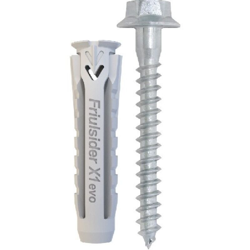 FRIULSIDER X1 EVO TASSELLO UNIVERSALE 4 SETTORI CON VITE TER LEGNO CON RONDELLA Tassello universale in nylon a 4 settori, Vite TER legno con rondella integrata zincata bianca. Codice Tassello Ø x L Vite Ø x L 60073b08040 8x40 6x50 60073b10050 10x50 6x60 60073b12060 12x60 8x70