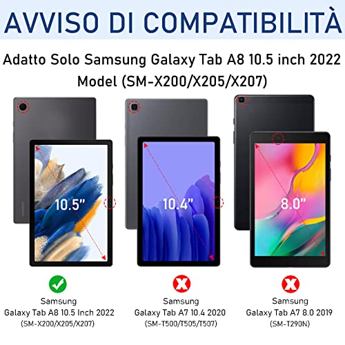 【Samsung Galaxy Tab A8 Tastiera Compatibilità】Questa custodia con italiana tastiera compatibile solo con il design del tablet Samsung Galaxy Tab A8 10,5 pollici 2022(Modello: SM-X200/X205/X207),non per altri modelli. Ha i tasti é.ç.§ e la tastiera è in italiano. Si prega di confermare il modello del tablet prima dell'acquisto.(Nota: S Pen non è inclusa).