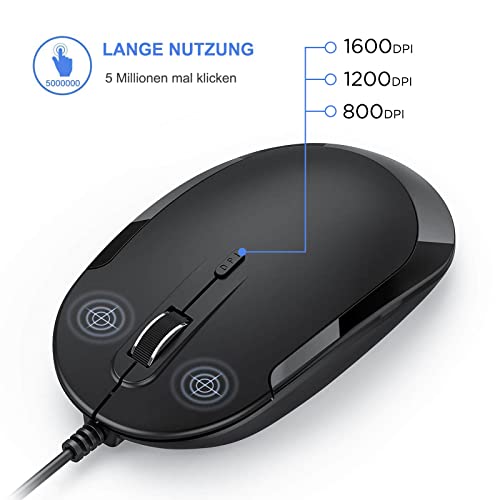 Mouse cablato con 3 livelli di DPI: questo mouse cablato DPI può essere regolato premendo il pulsante DPI sulla parte superiore del mouse. I livelli DPI sono 800-1200-1600. Il clic è silenzioso e dura oltre 5 milioni di clic.