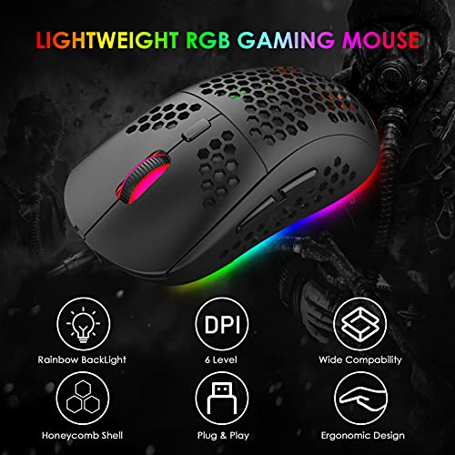 Set Tastiera e Mouse da Gioco RGB, Tastiera Meccanica Arcobaleno 87 Tasti Switch Blu + Mouse a Nido D'ape Leggero a 6400 DPI + Tappetino per Mouse Compatibile con PC, Mac, PS4, XBox - Nero