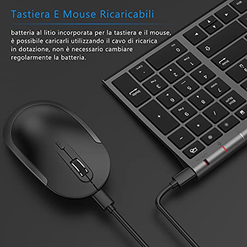 Kit Tastiera e Mouse Wireless Ricaricabile, Tastiera Italiano QWERTY Silenziosa, Ultra Sottile, Ricevitore USB Nano, Mouse DPI Regolabile per PC/Laptop, Windows 10/8/7/Vista/, Grigio