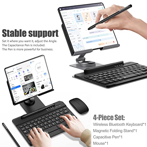 Set di 4 pezzi: layout QWERTY UK/USA. Contenuto della confezione: 1 tastiera wireless Bluetooth, 1 supporto pieghevole magnetico, 1 penna capacitiva, 1 mouse.
