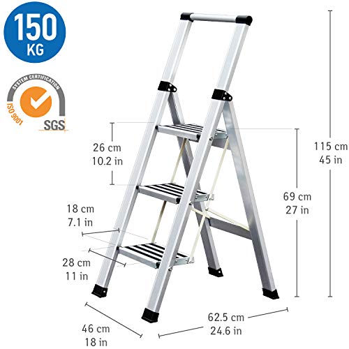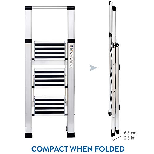 Tatkraft ADAMANT Scaletta Pieghevole in Alluminio a 3 Gradini, Robusta e sicura, Portata 150 kg, 3 Gradini Antiscivolo larghi 12 cm, Peso 4,8 kg, Certificato SGS
