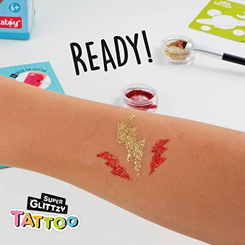 TATOY Super Glittzy - Set di tatuaggi glitterati Rocky. Il più piccolo set di tatuaggi super glitter per ragazzi contiene già tutto il necessario per creare fantastici tatuaggi glitterati. Include la pratica stazione di lavoro Super Glittzy Tattoo! Il set include: