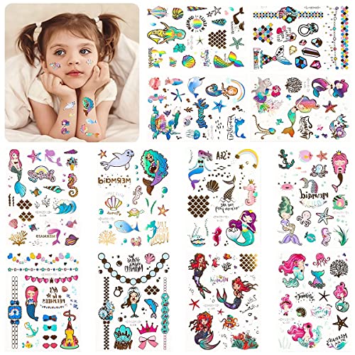 Tatuaggi Temporanei per Bambini, Tatuaggi per Bambini Sirena, Set di Tatuaggi per Bambini - Tatuaggi Finti Adesivi per Ragazze Ragazzi Compleanno Decorazioni per Feste Regalo,12 Fogli