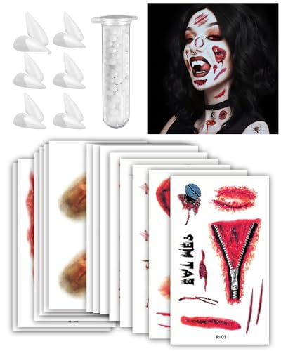 Tatuaggi Temporanei di Halloween, 60 fogli Cicatrice trucco tatuaggi di Halloween con 6 paia denti vampiro Accessorio per Halloween Cicatrici di zombie Tatuaggi per bambini adulti Cosplay Halloween