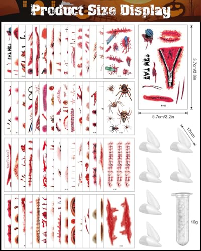 【Set di tatuaggi temporanei realistici】Migliora le tue decorazioni e i tuoi costumi di Halloween con questo set di 60 fogli di tatuaggi finti e 6 paia di denti da vampiro. Ogni foglio di tatuaggio include diversi disegni. Le cicatrici di Halloween in questi tatuaggi sembrano straordinariamente reali e naturali, rendendoli un fantastico trucco per stupire e spaventare i tuoi amici. I disegni realistici aggiungono un tocco inquietante e inquietante al tuo look generale di Halloween.