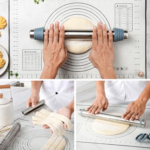 TAVADA Mattarello in acciaio inox,Mattarelli Antiaderenti,Mattarello Regolabile con 8 Anelli di Spessore,con Tappetino da Forno in Silicone Pennello Olio spatola per Pasta,Pizza,Torte