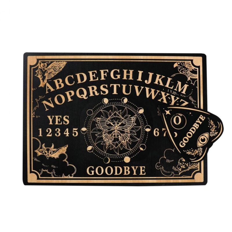 Tavola Ouija in legno con 26 lettere dalla A alla Z, numeri da 0 a 9 e le parole SI e NO. Usa l'indicatore a forma di cuore per vedere se gli spiriti hanno qualcosa da dirti! La tavola è un regalo divertente e un dettaglio decorativo, oltre a fornire un intrattenimento emozionante per la prossima cena. - Tavola Ouija in legno - 26 lettere e i numeri 0-9 - Indicatore a forma di cuore Specifiche: Colore: nero Materiale: legno Dimensioni: ca. 30 x 22 x 0,3 cm