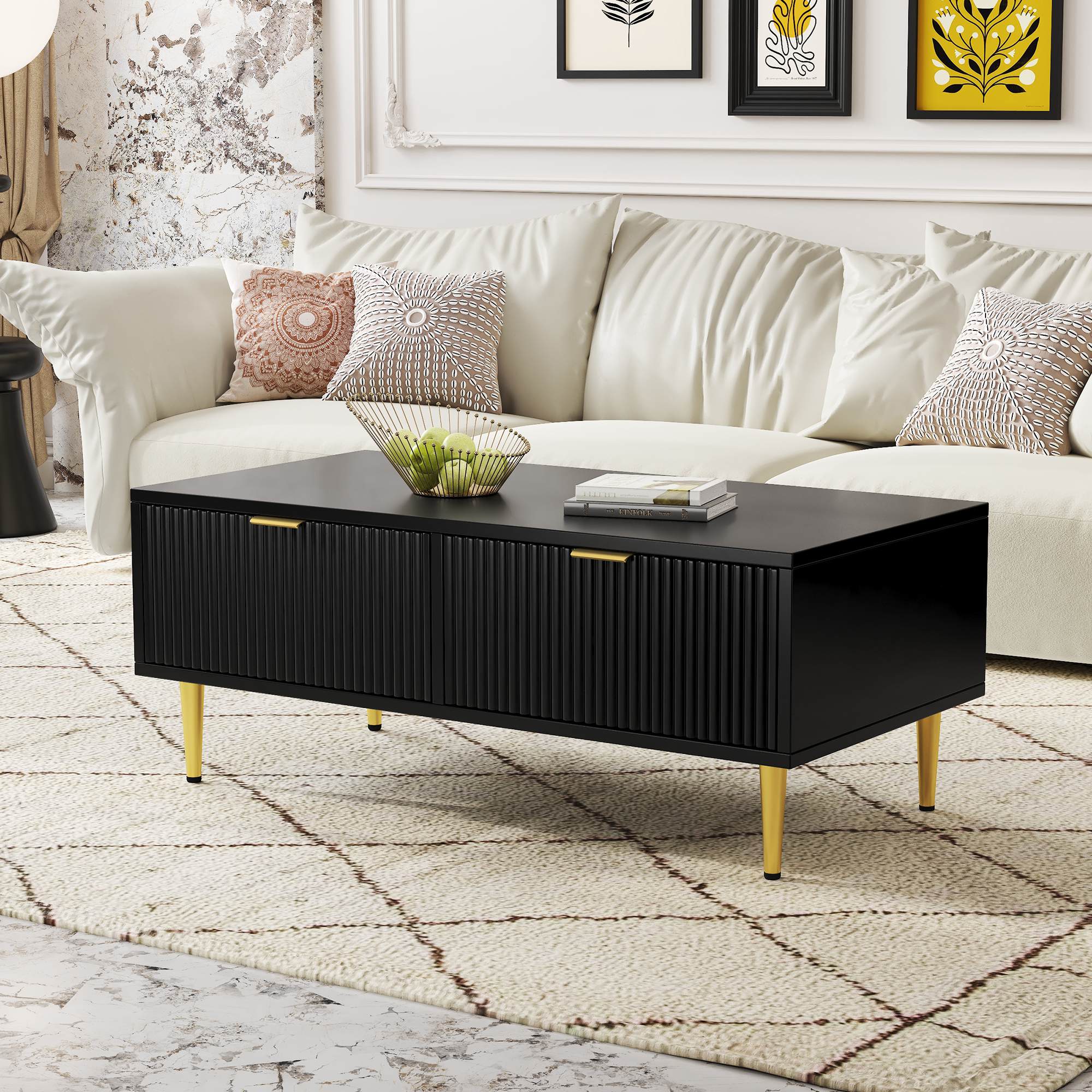Con dimensioni di 100L x 50P x 40A cm, il nostro elegante tavolino da caffè nero è un pezzo di arredamento senza tempo che aggiungerà un tocco di raffinatezza al tuo soggiorno. I manici e le gambe in metallo dorato conferiscono a questo tavolino un tocco di lusso e stile. Il tavolino dispone di due ampi cassetti e una placca frontale con design a strisce verticali, rifinita con una verniciatura di alta qualità per una superficie liscia e impeccabile. Le gambe dorate con piedini in plastica nera proteggono il pavimento dai graffi, rendendo questo tavolino non solo pratico ma anche un elemento di moda nel tuo spazio abitativo.