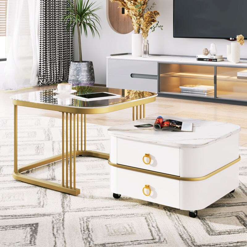 Descrizione lunga Questo elegante tavolino modulare è composto da un tavolo grande e un tavolino che possono essere utilizzati insieme o separatamente. La dimensione del tavolo grande è 60*60*42 cm e la dimensione del tavolo piccolo è 50*50*34 cm. Il tavolino presenta un piano in marmo lucido, mentre il tavolo grande presenta un piano in vetro trasparente, che si combina con strutture in metallo dorato e dorato per creare un look elegante e lussuoso. Per maggiore comfort e funzionalità, il tavolino è dotato di pratici cassetti e robuste guide in tre parti. La maniglia dorata intuitiva garantisce un funzionamento semplice e mette in risalto il design lussuoso. Specifica Dimensioni complessive 60*60*42+50*50*34 (cm) Carico del prodotto 20 kg GW/NW 25,8 kg/24 kg Colore Bianco e oro Materiale MDF lucido Sì Numero di colli 1 Origine RPC