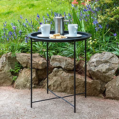 CKB LTD tavolino rotondo pieghevole da esterni e interni con vassoio rimovibile, in acciaio verniciato a polvere, singolo tavolo da giardino, per arredamento, colore nero
