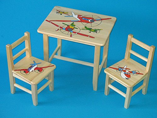 Tavolino per bambini completo di 2 sedie. Ottima come idea regalo, ideale per arredare la cameretta. Realizzato in legno di pino e disegnato a mano. PLANES