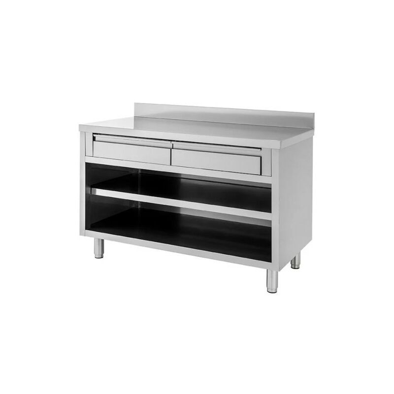 Codice RS4267 - Tavolo da lavoro a giorno, piano di fondo, ripiano intermedio, con schienale, modello RP-DSTAG2CE106A, costruito in acciaio inox 430, dimensioni cm. 100x60x85 (lxpxh). Alzatina spessore 20 mm e altezza 100 mm. Piano con spessore 4 mm in acciaio inox, rinforzato da un sottopiano in legno truciolare idrofugo spessore 18 mm. N.2 cassetti in acciaio inox rimovibili. Piedini regolabili in altezza.