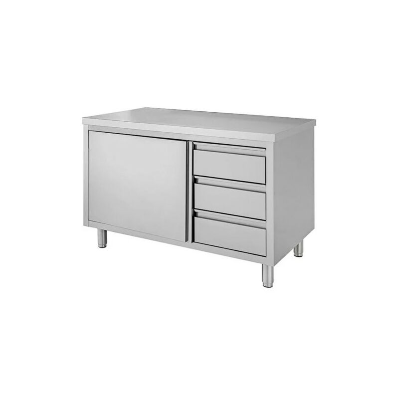 Codice RS4495 - Tavolo da lavoro armadiato, piano di fondo, ripiano intermedio, con schienale, n.1 porta battente tamburata, modello RP-DSTA3CDPBE127, costruito in acciaio inox 430, dimensioni cm. 120x70x85 (lxpxh). Piano con spessore 4 mm in acciaio inox, rinforzato da un sottopiano in legno truciolare idrofugo spessore 18 mm. N.3 cassetti in acciaio inox rimovibili. Piedini regolabili in altezza.
