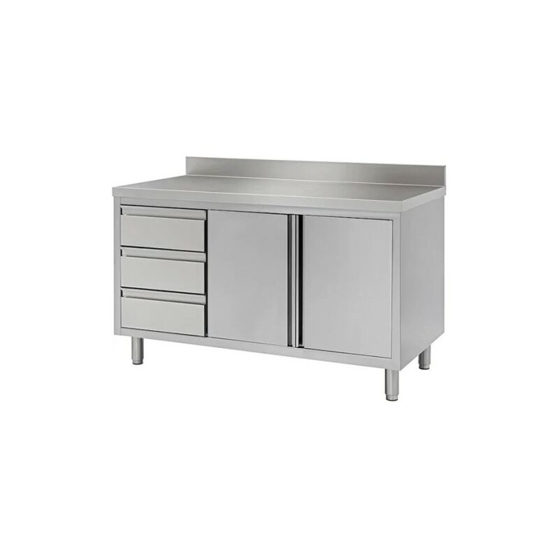 Codice RS4561 - Tavolo da lavoro armadiato, piano di fondo, ripiano intermedio, con schienale, n.2 porte battenti tamburate, modello RP-DSTA3CSPBE146A, costruito in acciaio inox 430, dimensioni cm. 140x60x85 (lxpxh). Alzatina spessore 20 mm e altezza 100 mm. Piano con spessore 4 mm in acciaio inox, rinforzato da un sottopiano in legno truciolare idrofugo spessore 18 mm. N.3 cassetti in acciaio inox rimovibili. Piedini regolabili in altezza.