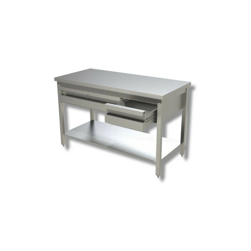 Codice RS4030 - Tavolo da lavoro su gambe e piano di fondo, modello RP-DSTG3CE167, costruito in acciaio inox 430, dimensioni cm. 160x70x85 (lxpxh). Piano con spessore 4 mm in acciaio inox, rinforzato da un sottopiano in legno truciolare idrofugo spessore 18 mm. N.3 cassetti in acciaio inox rimovibili. Gambe con profilo quadrato 40x40 mm con piedini regolabili in altezza. Fornito in kit smontato.