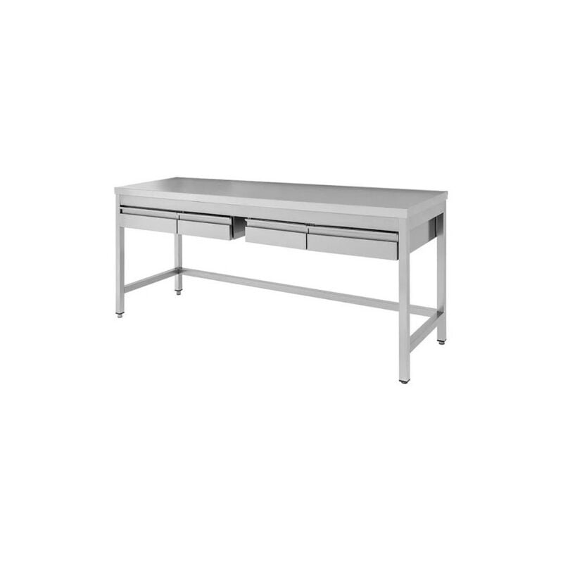 Codice RS4052 - Tavolo da lavoro su gambe, modello RP-DSTGSR4CE186, costruito in acciaio inox 430, dimensioni cm. 180x60x85 (lxpxh). Piano con spessore 4 mm in acciaio inox, rinforzato da un sottopiano in legno truciolare idrofugo spessore 18 mm. N.4 cassetti in acciaio inox rimovibili. Gambe con profilo quadrato 40x40 mm con piedini regolabili in altezza. Fornito in kit smontato.