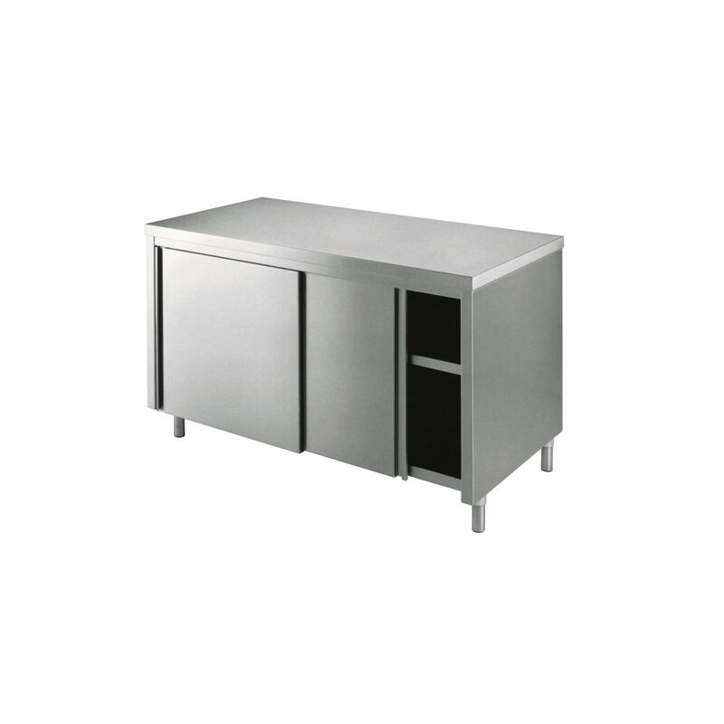 Codice RS5687 - Tavolo da lavoro armadiato, piano di fondo, ripiano intermedio, con schienale, antine scorrevoli tamburate, modello AC-EL/AN/180/8, costruito in acciaio inox 18/10 AISI 304 (no 430), dimensioni cm. 180x80x85 (lxpxh). Piano con spessore 4 mm in acciaio inox, rinforzato da un sottopiano in legno truciolare idrofugo spessore 18 mm. Piedini regolabili in altezza.
