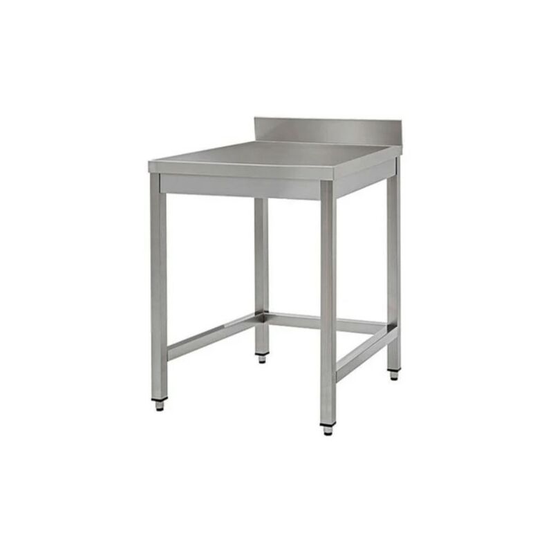 Codice RS3918 - Tavolo da lavoro su gambe, modello RP-DSTGSRE056A, costruito in acciaio inox 430, dimensioni cm. 50x60x85 (lxpxh). Alzatina spessore 20 mm e altezza 100 mm. Piano con spessore 40 mm in acciaio inox, rinforzato da un sottopiano in legno truciolare idrofugo spessore 18 mm. Gambe con profilo quadrato 40x40 mm con piedini regolabili in altezza. Fornito in kit smontato.