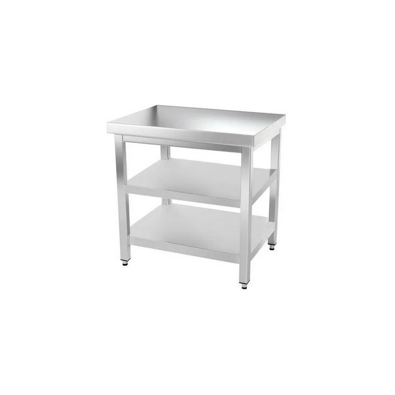 Codice RS3969 - Tavolo da lavoro su gambe, piano di fondo e ripiano intermedio, modello RP-DSTG2RE057, costruito in acciaio inox 430, dimensioni cm. 50x70x85 (lxpxh). Piano con spessore 4 mm in acciaio inox, rinforzato da un sottopiano in legno truciolare idrofugo spessore 18 mm. Gambe con profilo quadrato 40x40 mm con piedini regolabili in altezza. Fornito in kit smontato.