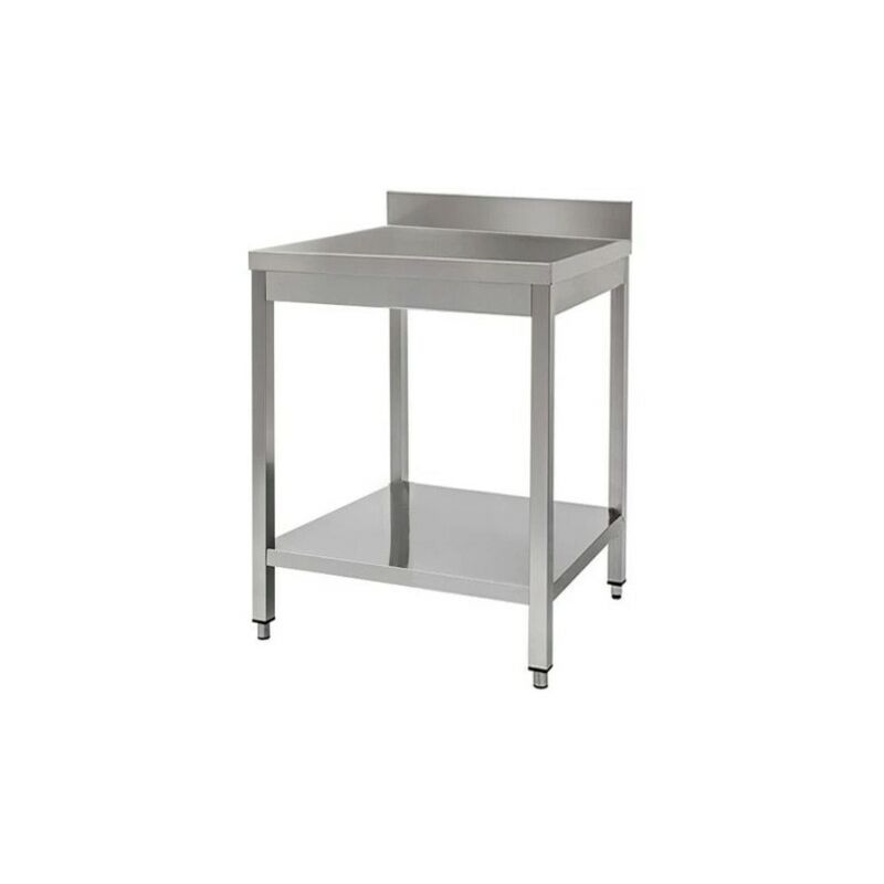 Codice RS3854 - Tavolo da lavoro su gambe e piano di fondo, modello RP-DSTGE096A, costruito in acciaio inox 430, dimensioni cm. 90x60x85 (lxpxh). Alzatina spessore 20 mm e altezza 100 mm. Piano con spessore 40 mm in acciaio inox, rinforzato da un sottopiano in legno truciolare idrofugo spessore 18 mm. Gambe con profilo quadrato 40x40 mm con piedini regolabili in altezza. Fornito in kit smontato.