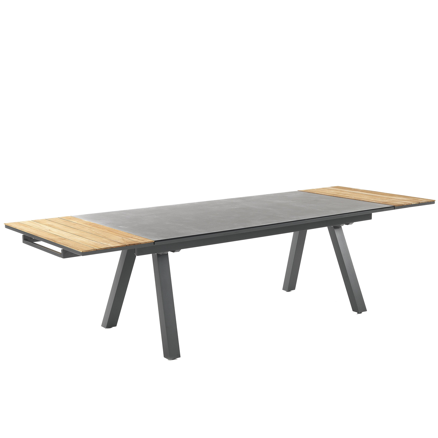 Novah è uno speciale tavolo da esterni realizzato da OresteLuchetta, brand del gruppo Tomasucci. Grazie alla sua struttura in alluminio e al ripiano in vetro temperato color antracite, è resistente ed elegante. Riesce a creare uno spazio unico in giardino o in terrazzo. Accoglie comodamente da 8 a 12 posti! Con le sue allunghe in teak con finitura rovere, posizionate sotto il piano del tavolo, si adatta facilmente a qualsiasi spazio e stile. Dimensioni: 200/245/290X76X100 cm.