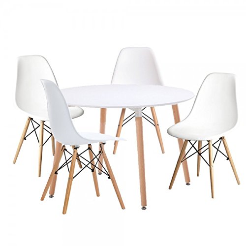 Tavolo con piano di legno laccato in colore bianco e gambe in legno di faggio naturale.