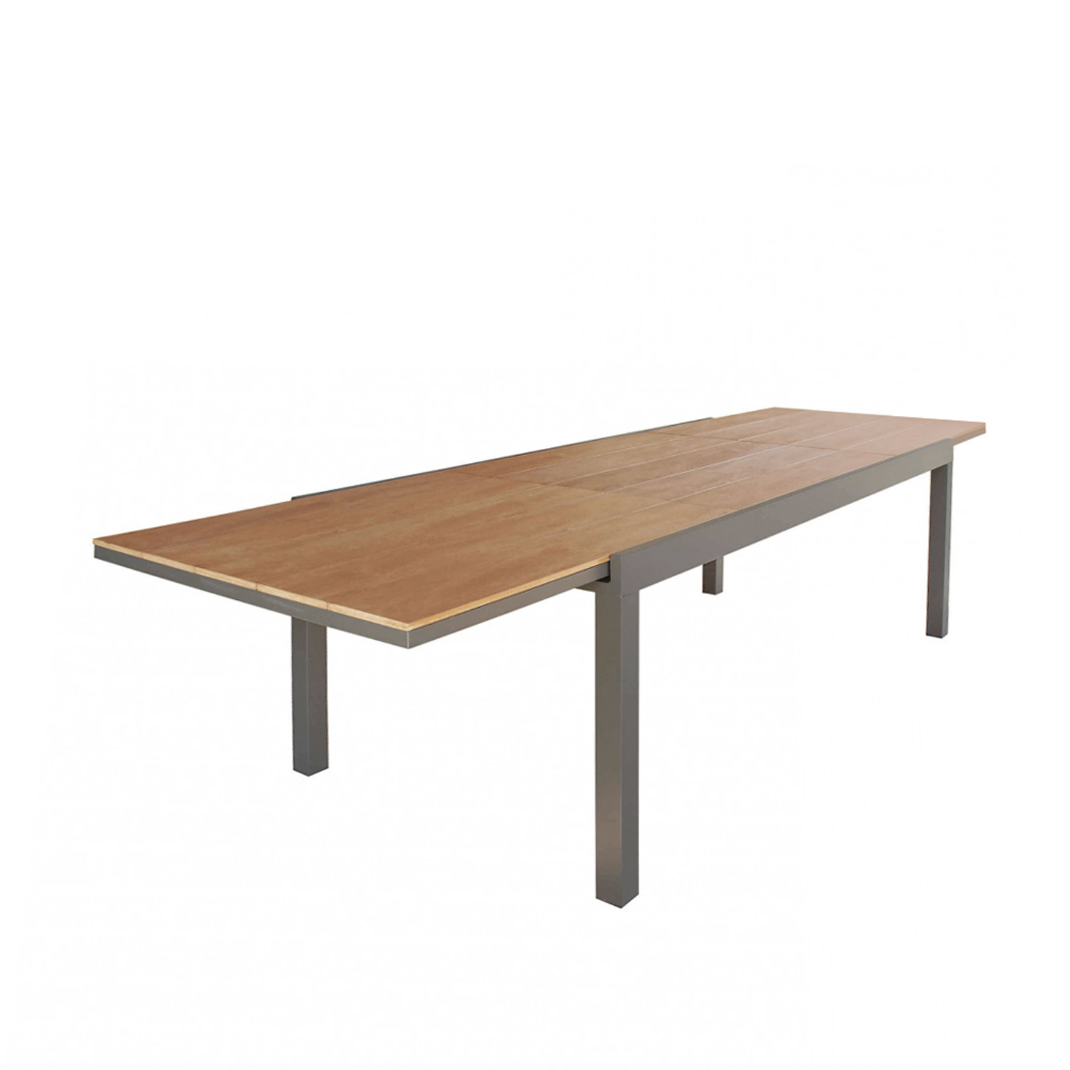 Un elegante tavolo da esterni con struttura in alluminio e piano in polywood. Il contrasto di colori tra il delicato taupe della struttura ed il color legno del piano, esalta la sua moderna eleganza. Otre ad essere esteticamente molto bello, questo tavolo da giardino è super funzionale. L'ampia superficie del piano può essere allungata per offrire ancora più spazio a te ai tuoi ospiti. Passa infatti da 8 a 10 posti con pochi semplici gesti. Dimensioni: 200-300x74x95 cm.