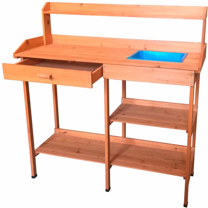 Tavolo da lavoro da giardino in legno naturale . Adatto per lavori da giardinaggio, dispone di ripiani inferiori . Questo modello ha un lavandino e un cassetto per custodire piccoli utensili . Realizzato in legno, durevole nel tempo. Dal semplice assemblaggio, è necessario un trapano per unire la struttura. Lo spessore del legno è di 10 mm e apporta al mobile robustezza e durata. Questo tavolo è provvisto di un trattamento antimicotico e antiumidità. Misure: 44x116x125 cm, ripiani inferiori. I nodi presenti nel legno variano a seconda dell'albero. Applicare un trattamento di mantenimento annuale per preservarne il colore. Si consiglia di avere uno spazio aggiuntivo nell'area in cui verrà posizionato il prodotto;