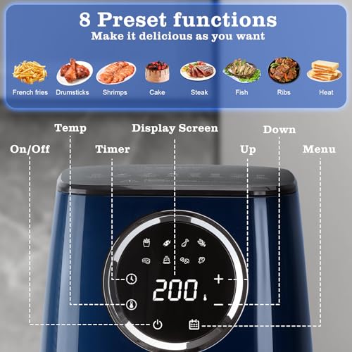 【Menu 8 in 1】 Preimposta 8 menu di cottura con un tocco, tra cui patatine fritte, stringa di carne, verdure, pollo, bistecca, gamberetti, torte e pesce. Personalizza il tempo di cottura e la temperatura ideali per ogni ingrediente;
