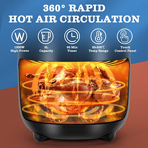 Capacità adeguata. La friggitrice ad aria calda dal design elegante e compatta ha una capacità di 3L e 1300W, ideale per 1-3 persone. Con un ingombro ridotto per adattarsi al tuo piano cucina e risparmiare spazio.