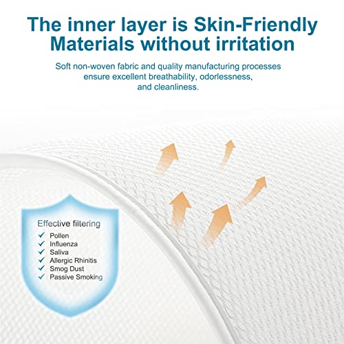 5 strati di mascherine FFP2: 2 strati esterni di tessuto non tessuto + 2 strati filtranti ultrafini di fibre morbide + strato interno di tessuto non tessuto delicato sulla pelle. Soddisfa lo standard FFP2 con una capacità di filtrazione superiore del 95%. Traspirante e confortevole.