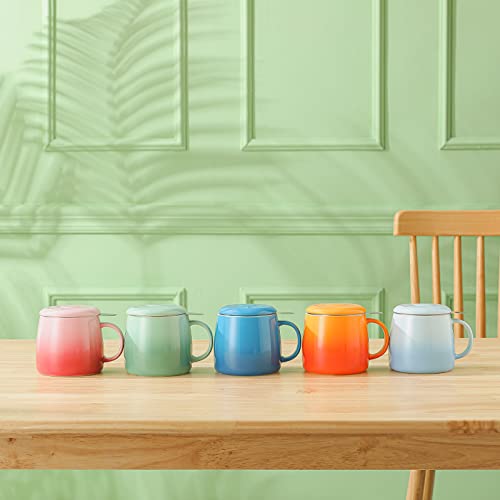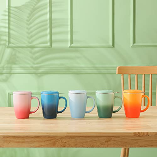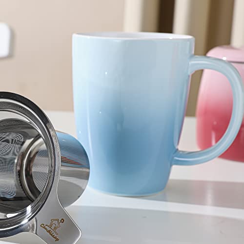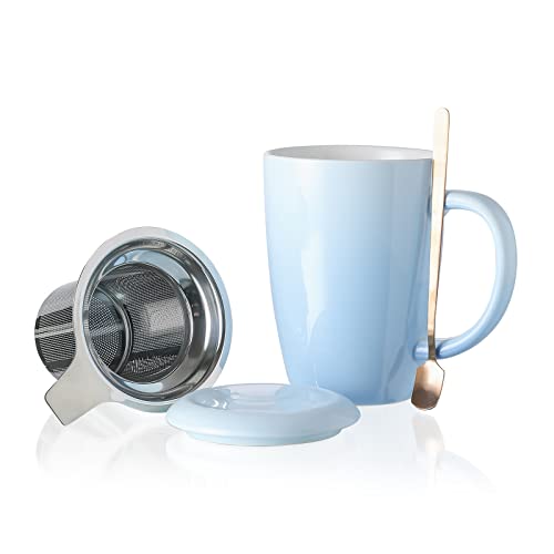 Tazza da Tè in Ceramica con Infusore, Cucchiaio e Coperchio, 385ml, Henten Home Tazza con Filtro da Tè Grande per Tè, Caffè, Latte-Adatto al Microonde e alla Lavastoviglie (385ml,Blu Cielo)